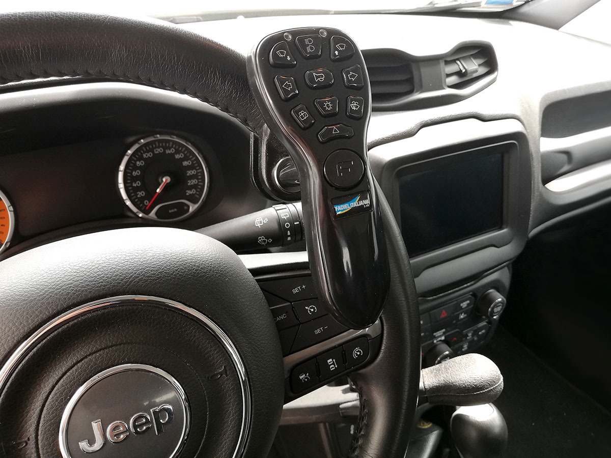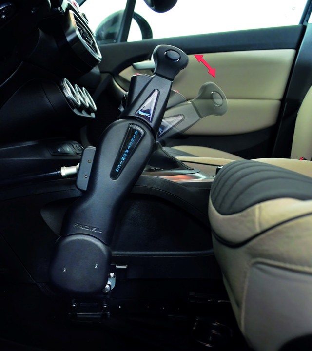 Rankinio valdymo svirtis prijungiama prie automobilio sistemos. Pirmyn - stabdis, atgal - akseleratorius, papildomų funkcijų mygtukai - ant svirties.